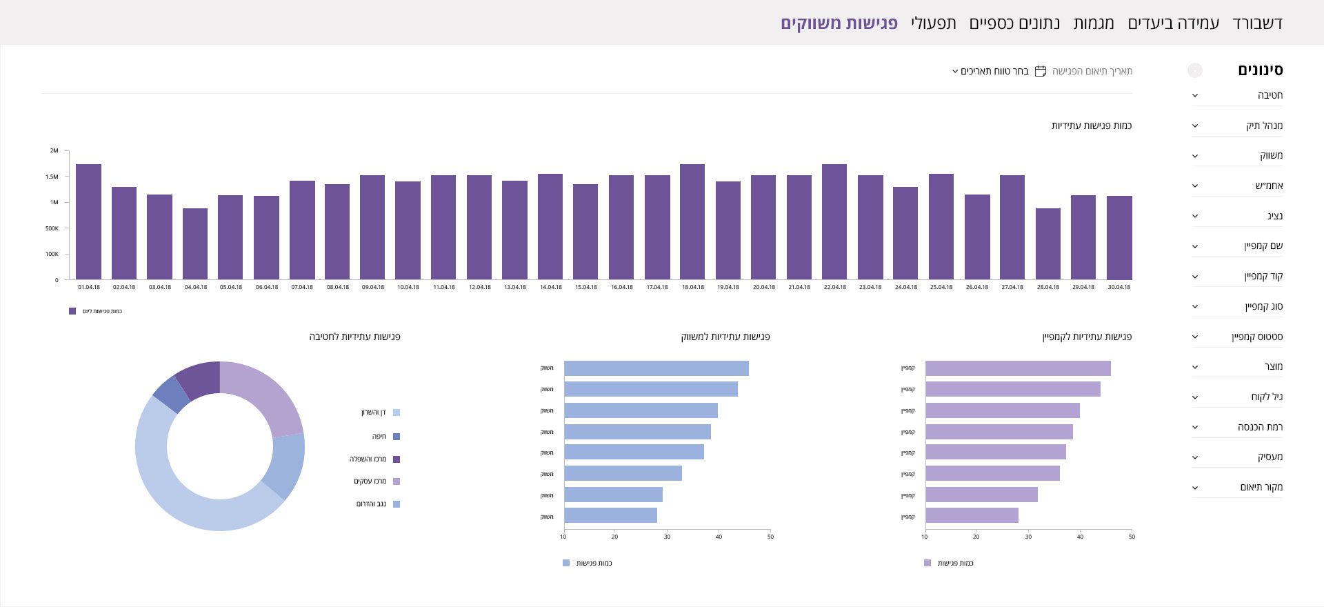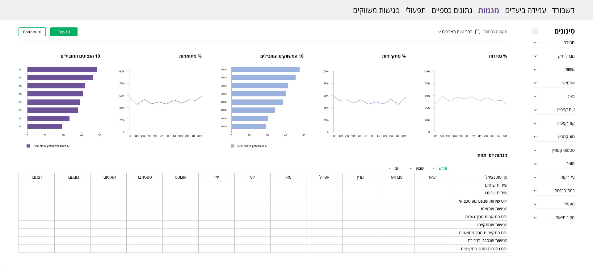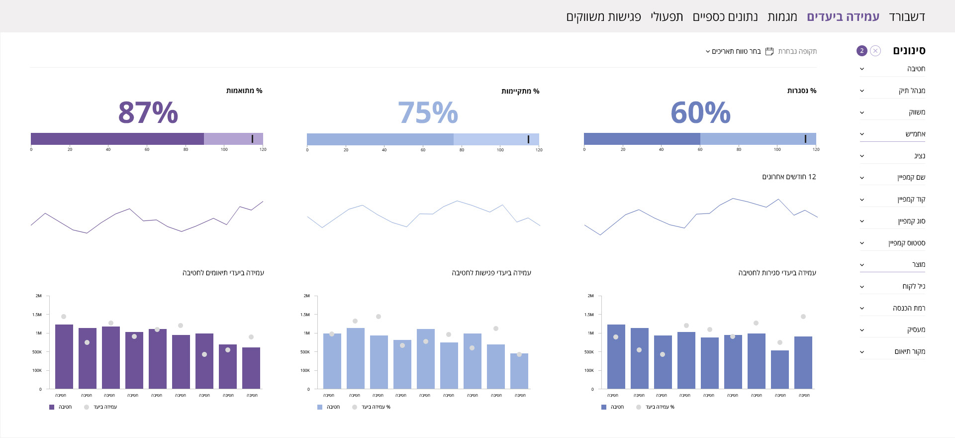In this model, every user has a long list of filters to choose from, but he or she always starts with the most profitable campaign. From there, s/he can get a good idea of what percentage of scheduled meetings resulted in a purchase. With deeper inspection they learn which teams are fulfilling their quotas, and can review sales team data over the past period (either per year, or by another period of time of their choice). They can further re-sort lists according to best employees, product turnover, and so on.