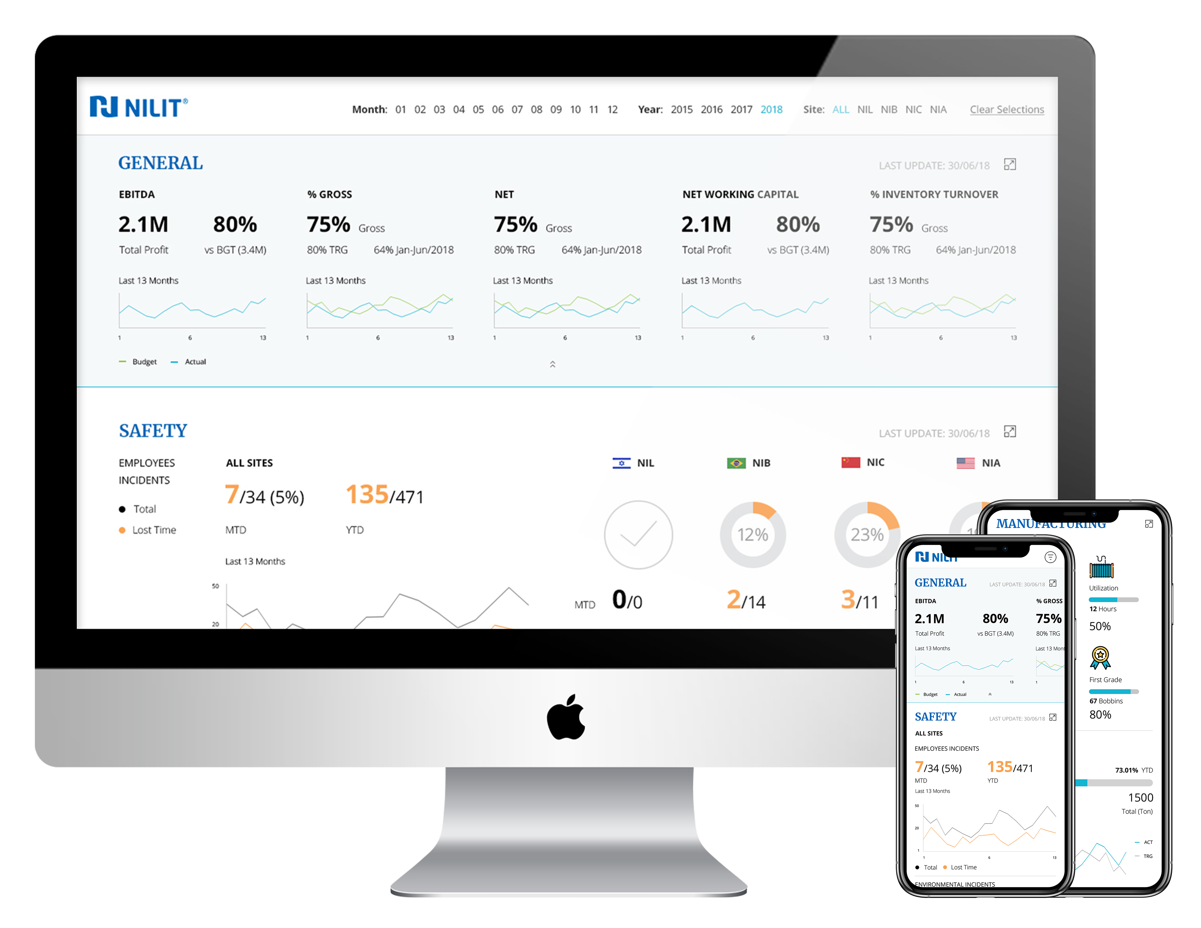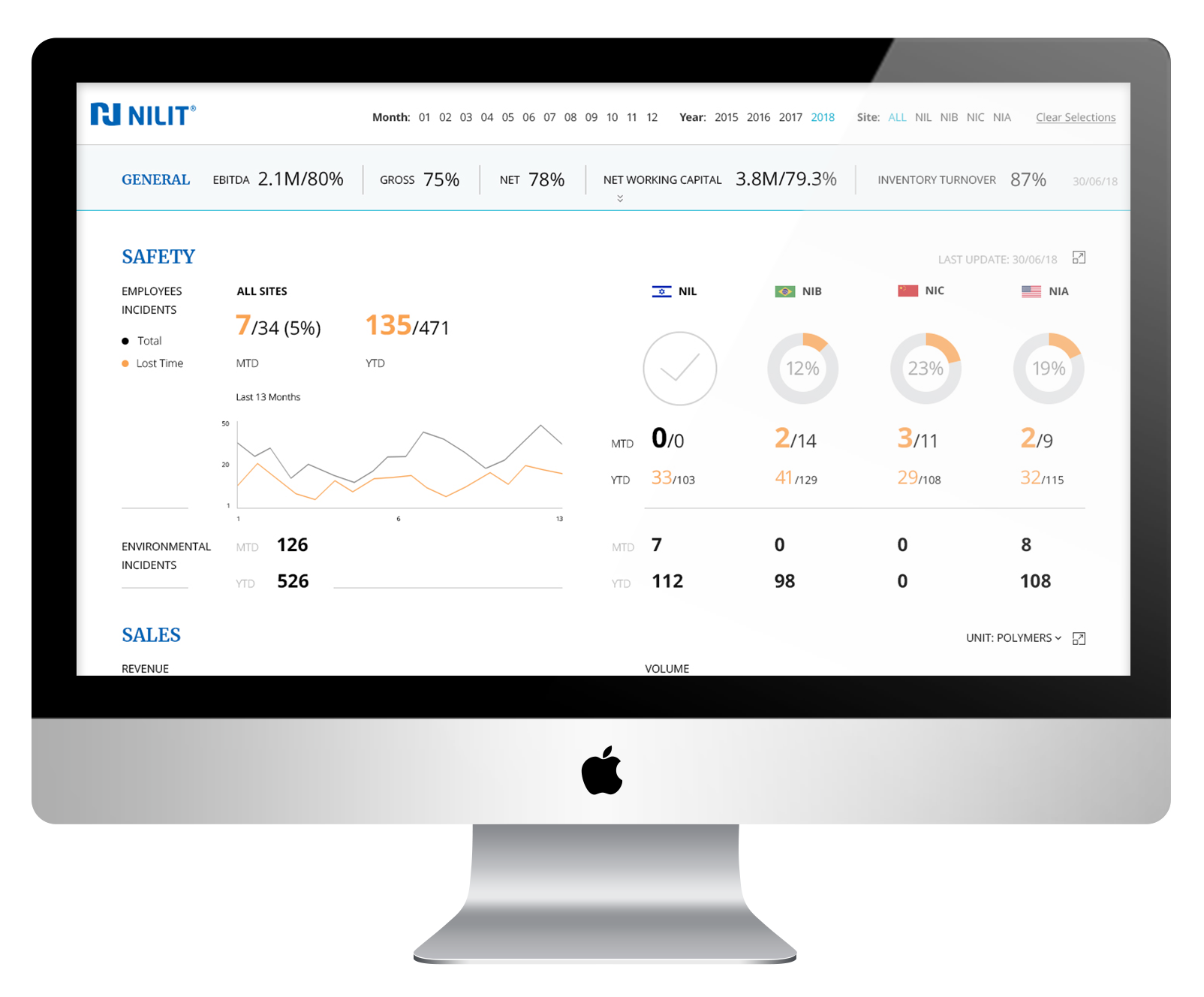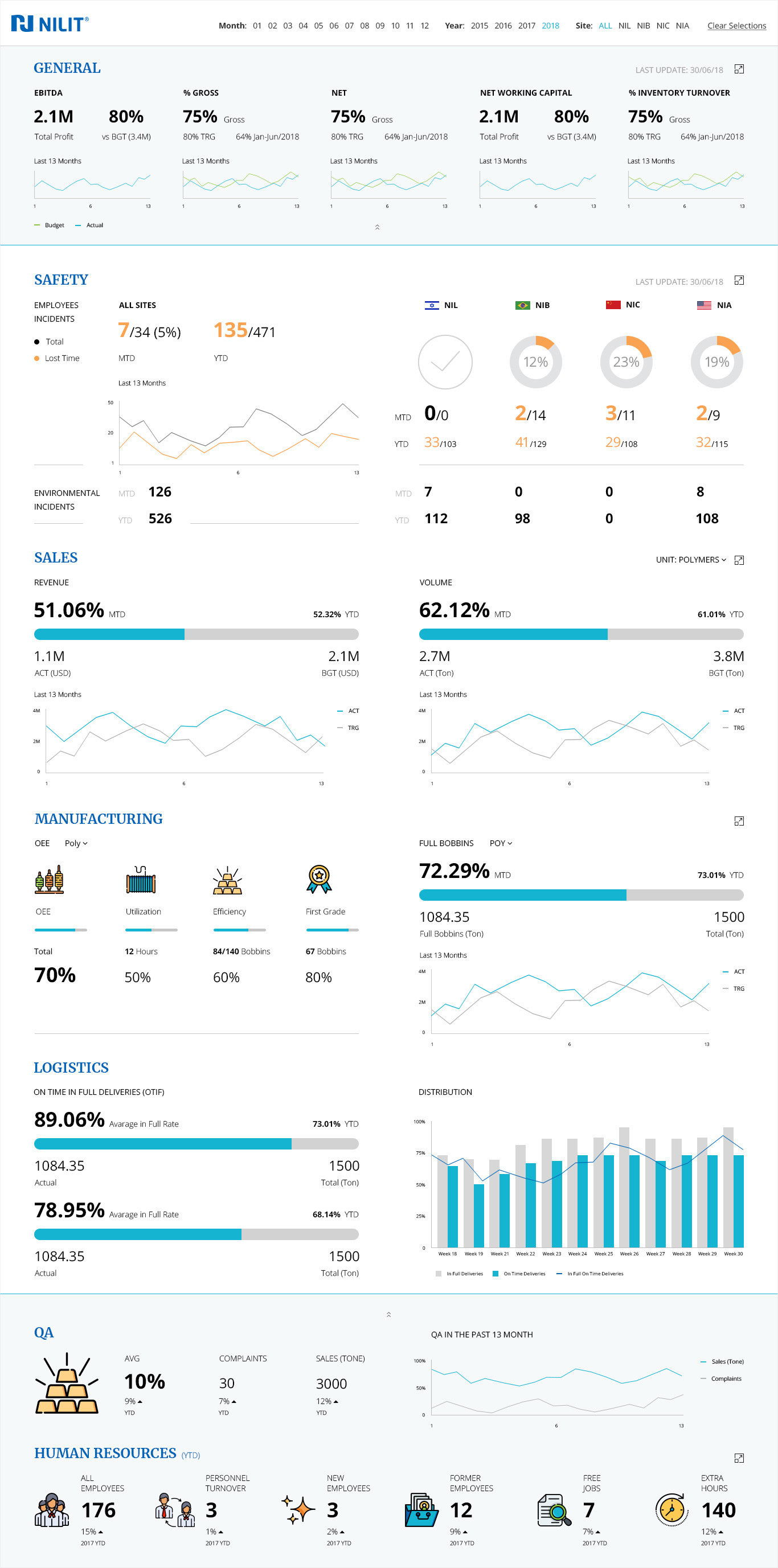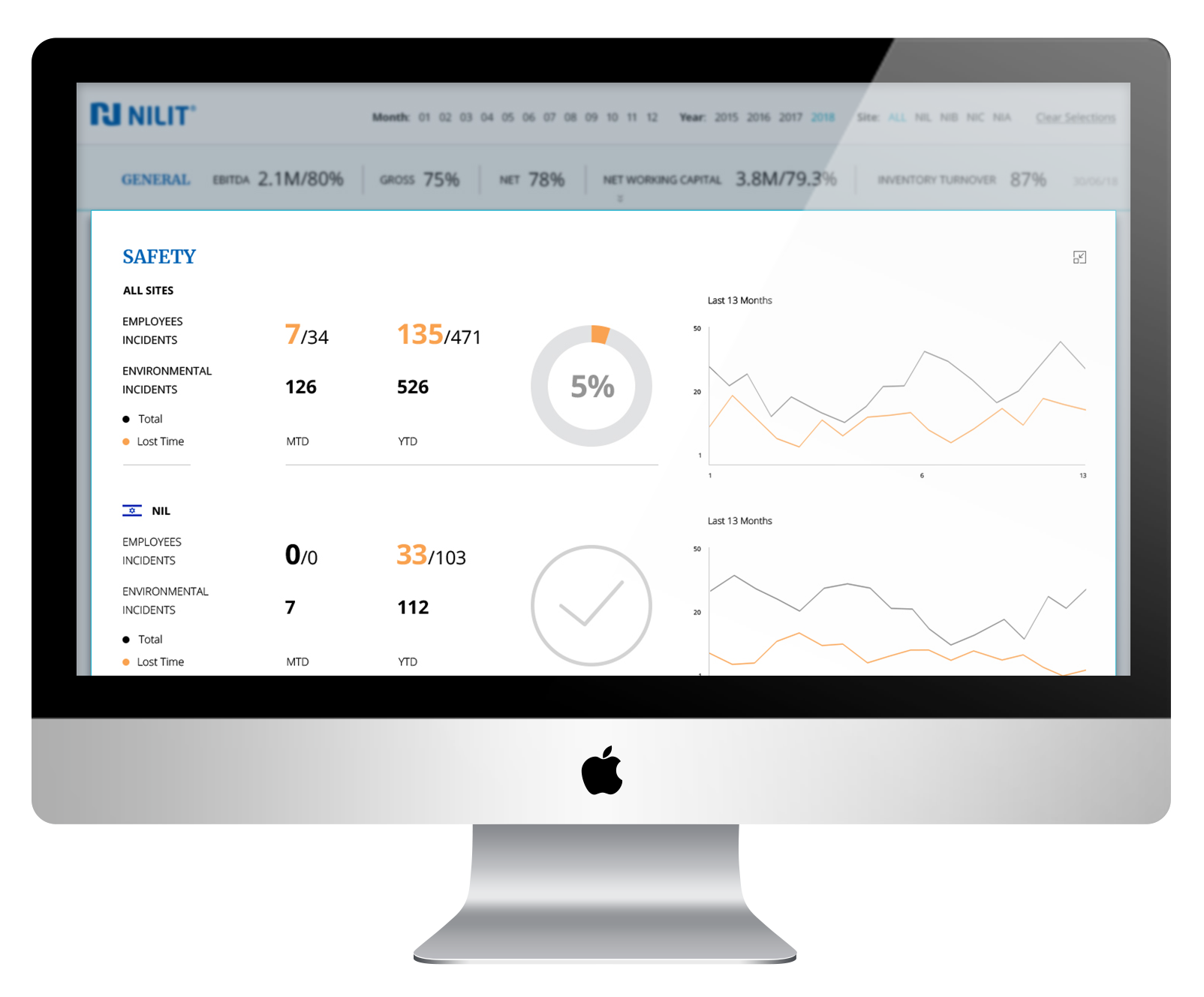 The first rule in a factory is “Safety First!”—the same holds here. As a company that strives for a safe work environment, it was important for Nilit to see how many employees and environmental incidents were reported over a selected time period. The most important safety incidents are the ones that can cause loss of time, and for this reason I used my typographic tools to highlight them as much as possible.
