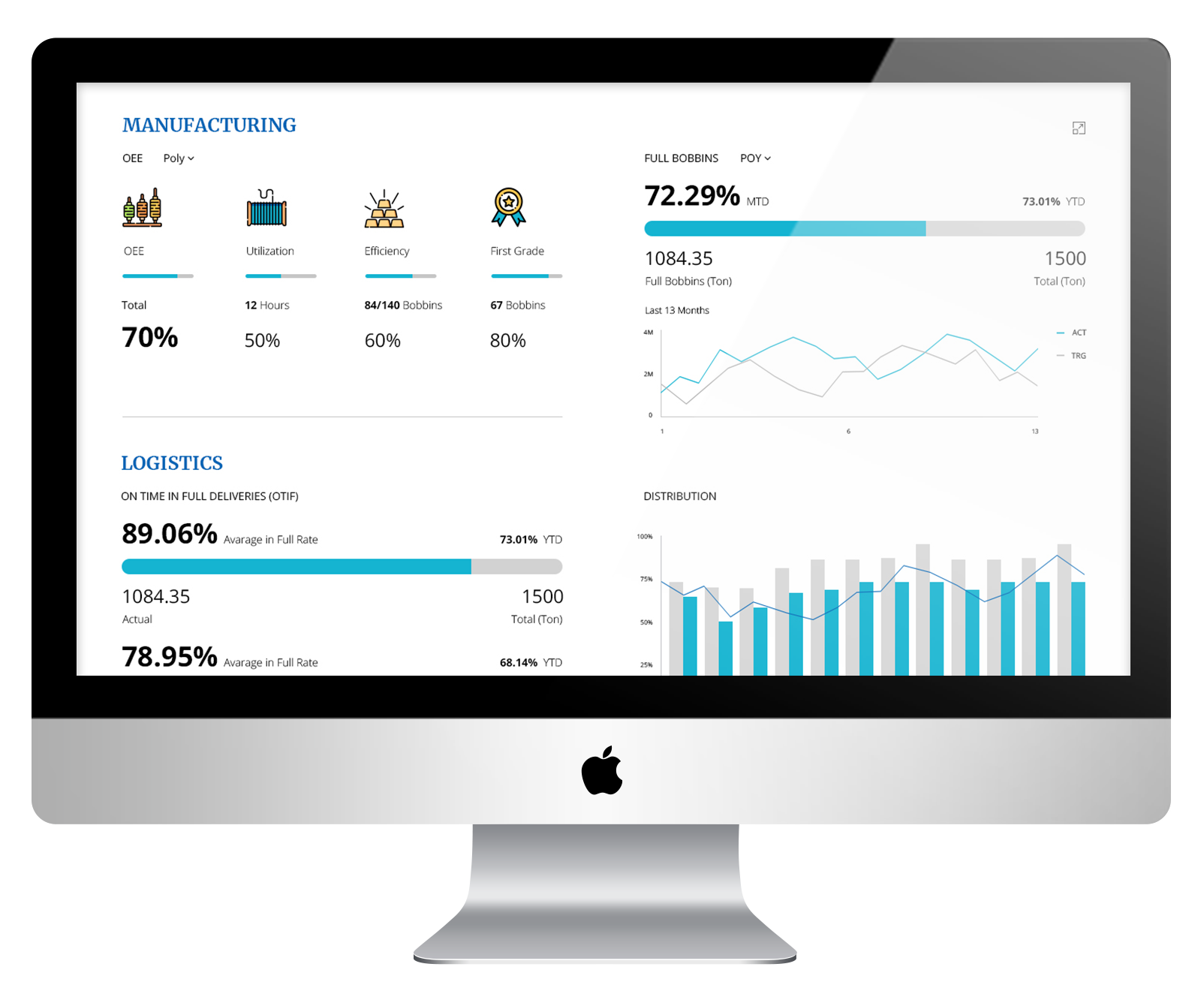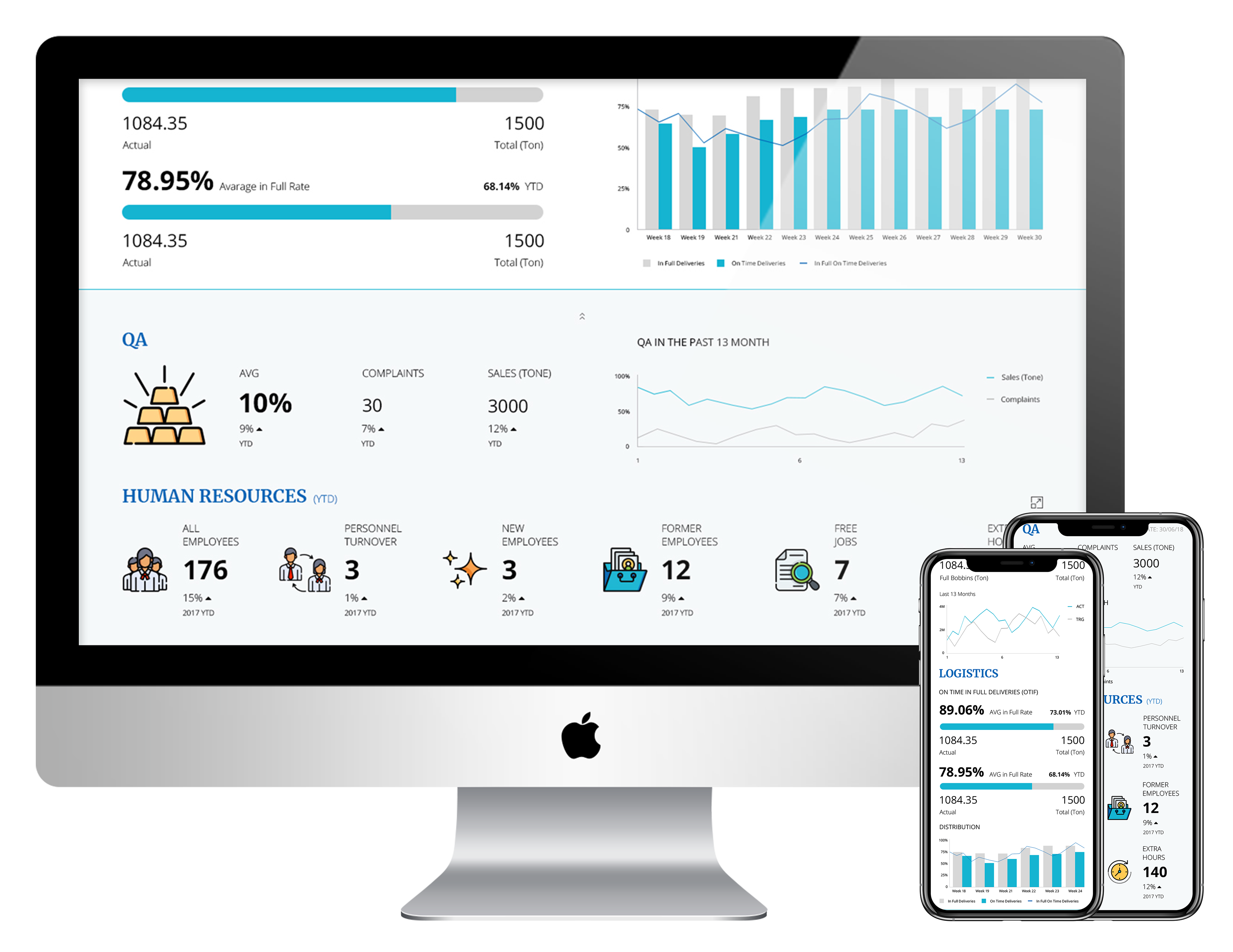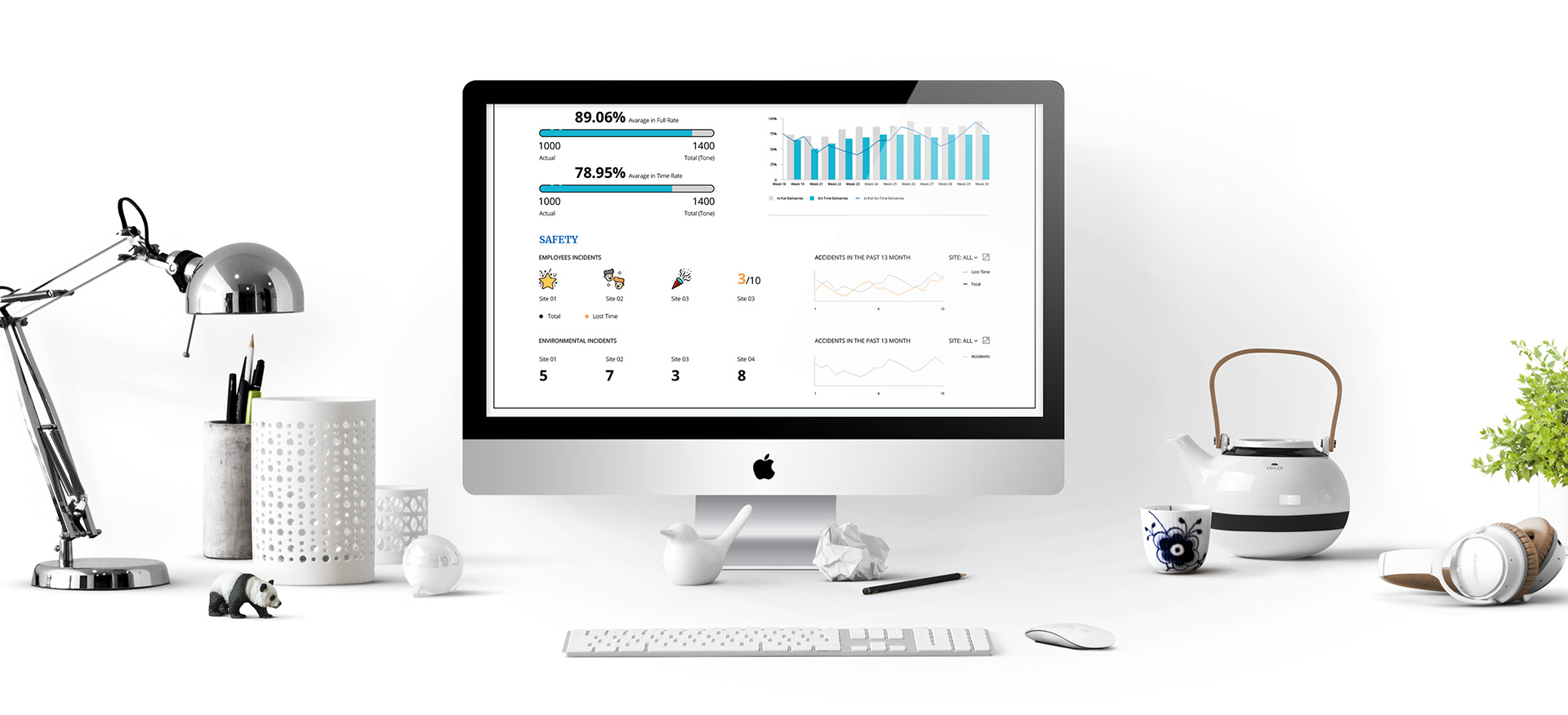 We used the main colors of the company (as presented on its website) to create a clear page with highlighted hierarchy. The user sees the KPIs of his site (the page attached is from the CEO’s point of view), updated once a month.